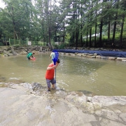 식사 후 계곡으로 나왔습니다. 다리를 건너면!수영장이 있습니다. 물은 그렇게 차갑지 않고 무릎 정도의 높이였기 때문에 아이들이 즐겁게 놀 수 있었습니다.레저 시트, 캠핑 의자, 차가운 음료를 가지고 가는 것을 추천합니다.다리 아래로 흐르는 계류는 발목 정도의 깊이이기 때문에 발을 담그고 있기에 딱 좋았습니다.식당 건물에는 에어건이 있어서 큰 튜브에도 바람을 넣기 쉬웠습니다.샤워실은 없고 밖에 있는 화장실… 저는 이용하지 않지만 흙투성이라서 필요한 경우 이용해주세요.배부르게 식사도 하고 편하게 물놀이를 즐길 수 있어서 좋았습니다.